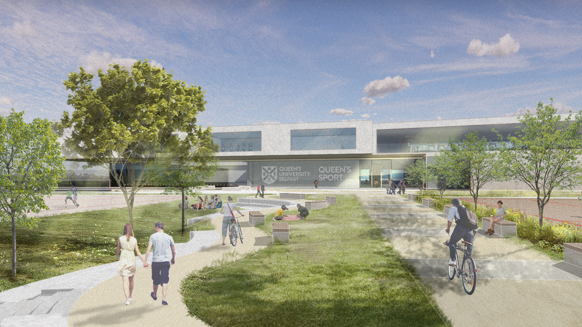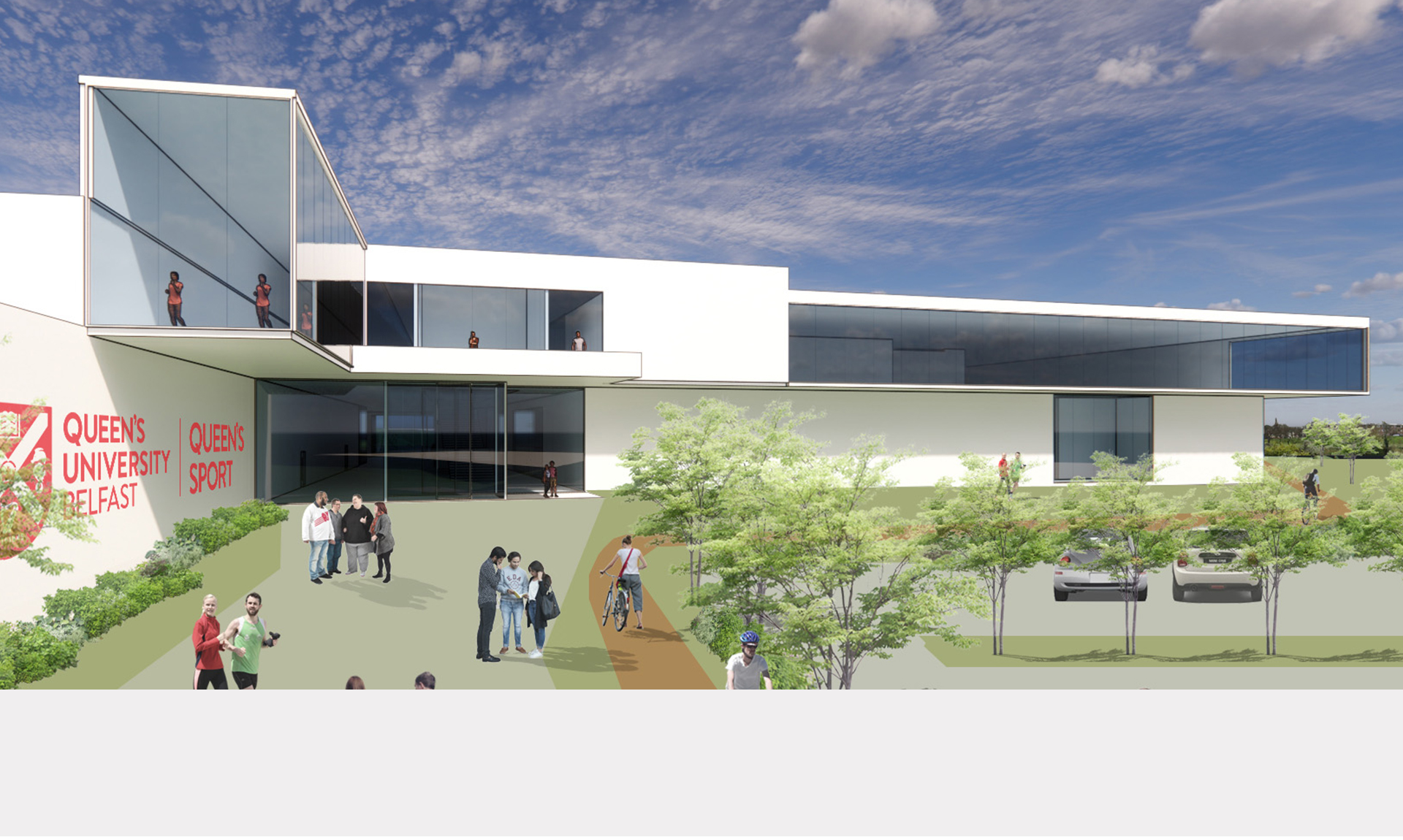 The site, located near Queen’s University, the Botanic Gardens, and the River Laggan, includes the original PEC and recent additions such as the Rotunda and 3G pitches. Moreover, serving as a major hub, the site benefits from a large car and coach park accessible from Stranmillis Embankment Road. The design, therefore, aims to enhance green connections between the university and surrounding parks, integrating a “promenade” within the building that links the café area to the main entrance. This pathway will, consequently, become the building’s heart, connecting public spaces with sports facilities and fostering a vibrant “Varsity” atmosphere. Additionally, outdoor facilities will be situated to connect seamlessly with the Botanic Gardens, while parking remains conveniently located to the south. Furthermore, the design leverages the site’s sloping terrain, with the café entrance aligned with the existing PEC entrance to minimize excavation.