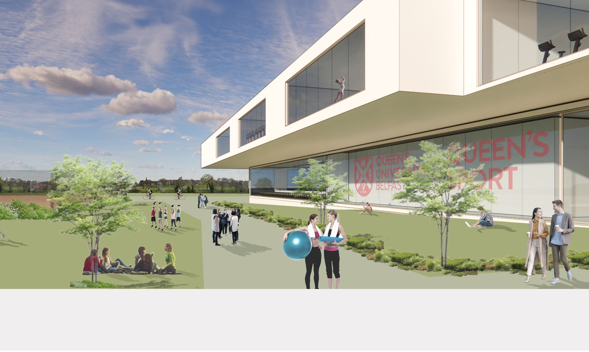 The site, located near Queen’s University, the Botanic Gardens, and the River Laggan, includes the original PEC and recent additions such as the Rotunda and 3G pitches. Moreover, serving as a major hub, the site benefits from a large car and coach park accessible from Stranmillis Embankment Road. The design, therefore, aims to enhance green connections between the university and surrounding parks, integrating a “promenade” within the building that links the café area to the main entrance. This pathway will, consequently, become the building’s heart, connecting public spaces with sports facilities and fostering a vibrant “Varsity” atmosphere. Additionally, outdoor facilities will be situated to connect seamlessly with the Botanic Gardens, while parking remains conveniently located to the south. Furthermore, the design leverages the site’s sloping terrain, with the café entrance aligned with the existing PEC entrance to minimize excavation.